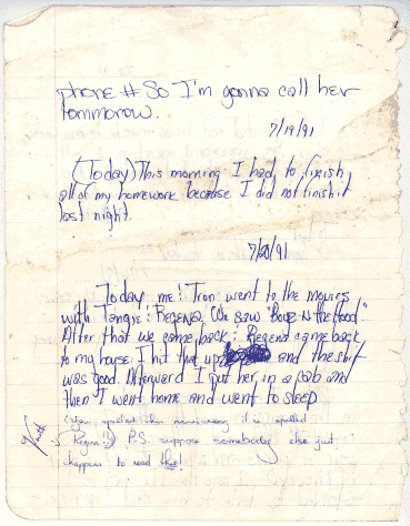 A found diary page describing the events of a summer school student's July. The first finder of this product added her own comments to the bottom of page two.