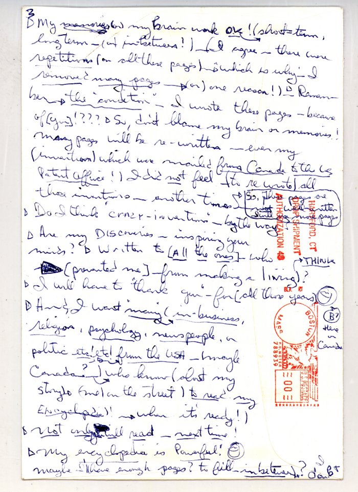 These notes were found on a street corner on Lexington in midtown Manhattan, stored in a free newspaper vending machine. They record the flow of consciousness of a homeless man who is writing a powerful encyclopedia.